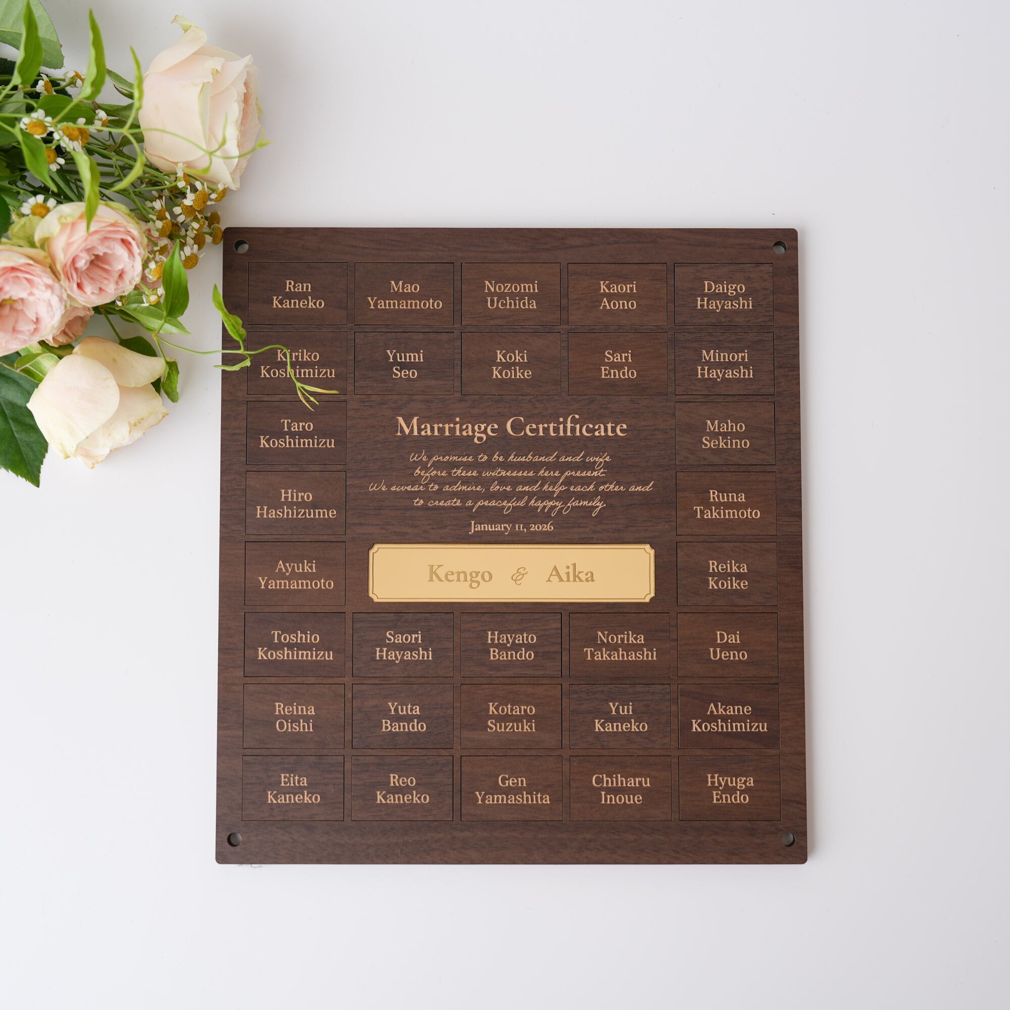 中央に宣誓文が入った、ゲスト参加型の木製結婚証明書❉