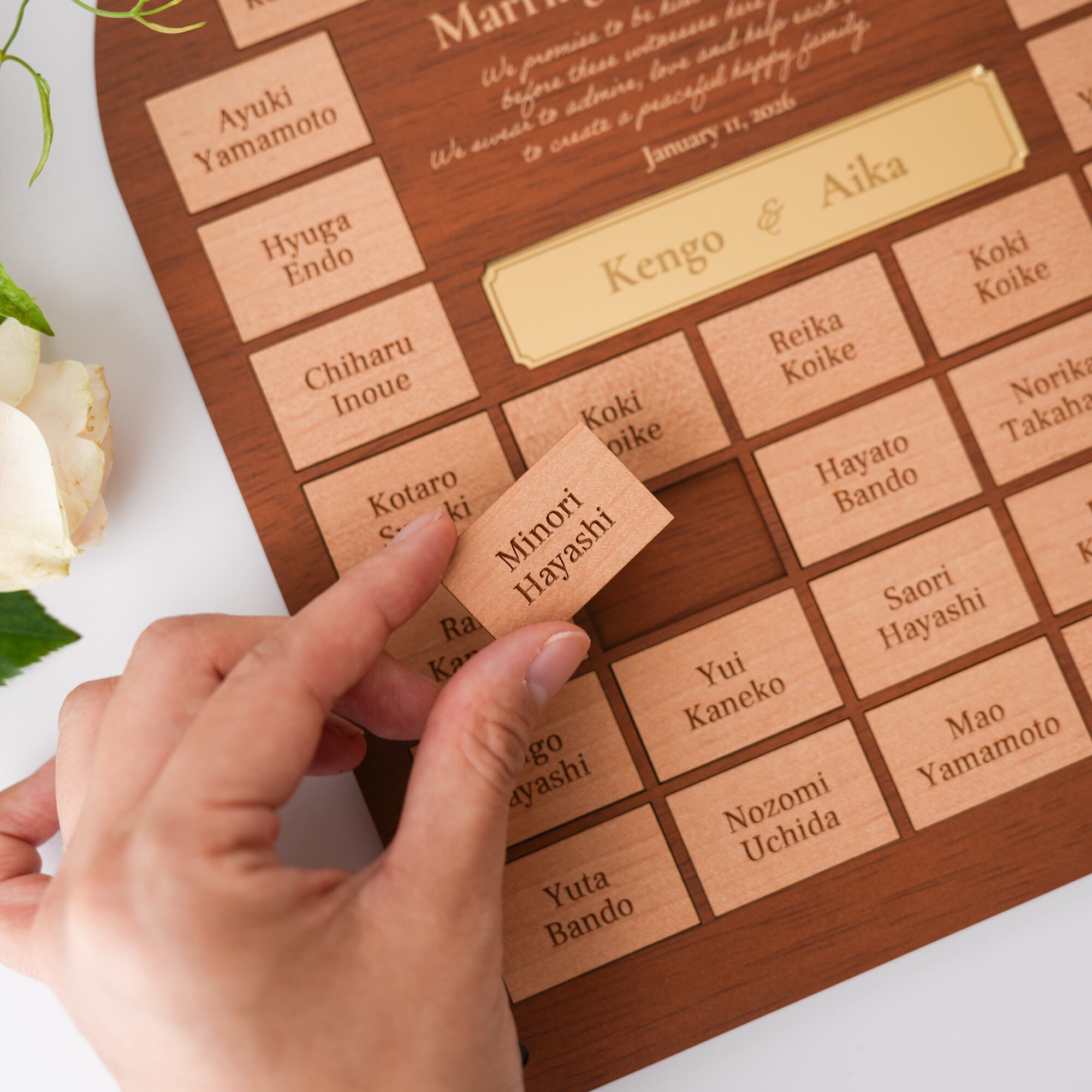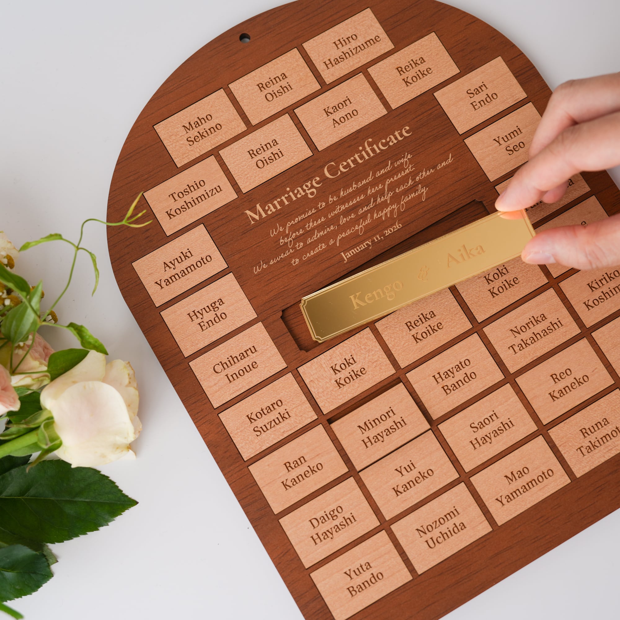 中央に宣誓文が入った、ゲスト参加型の木製結婚証明書❉